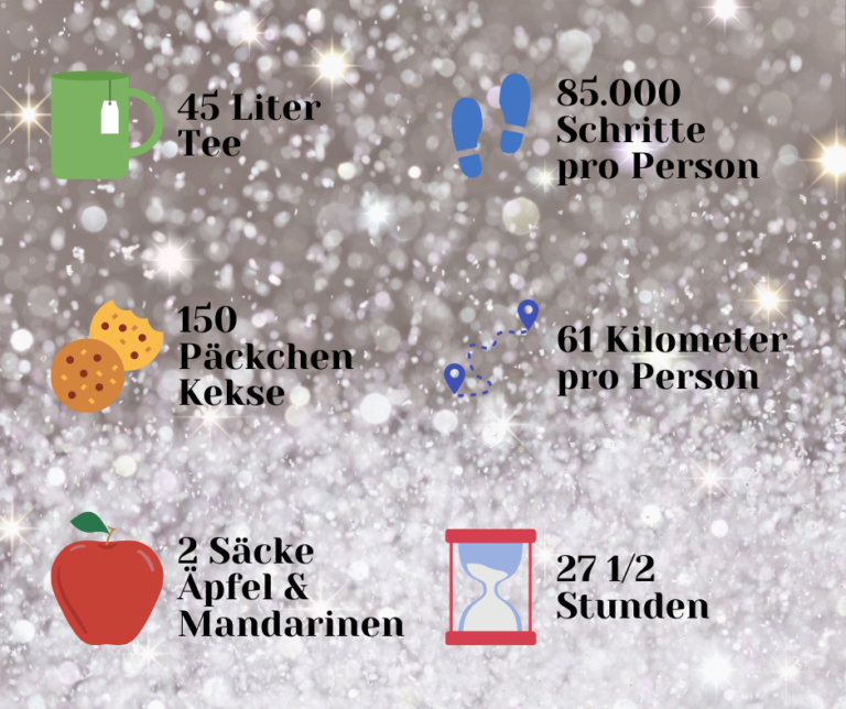Großartige Freunde, Arbeitskollegen und Verwandte oder besser gesagt, unsere Helferlein unterstützten uns liebenswerterweise mit Sachspenden in Form von Keksen, Tee und Obst. Weitere Interessante Daten zur Weihnachtsaktion findest du oben im Beitragsbild.