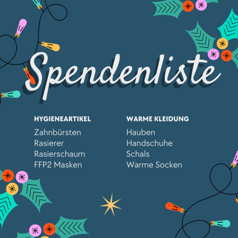 Falls du uns mit einer Sachspende unterstützen möchtest, freuen wir uns besonders über die nachfolgenden Dinge: Weihnachtskekse aller Art, Kleidung (ausschließlich Hauben, Schals, Handschuhe und warme Socken) und Hygieneartikel (Zahnbürsten, Rasierer, Rasierschaum, Desinfektionsmittel, FFP2 Masken).