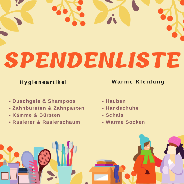 Der FRÜÜÜHLING ist daaa und die Wintersachen verschwinden womöglich auch aus deinem Schrank. Ganz nach dem Motto, der nächste Winter kommt bestimmt, sammeln wir bereits Spenden in Form von Sachspenden wie z.B. alte Wintersachen, Hygieneprodukte, oder finanzieller Unterstützung für unsere nächste Weihnachtsaktion.